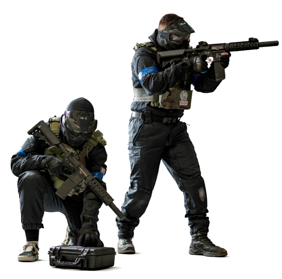 airsoftové repliky, sadu zásobníků, ochranné vesty a celoobličejové masky, střelivo zdarma.